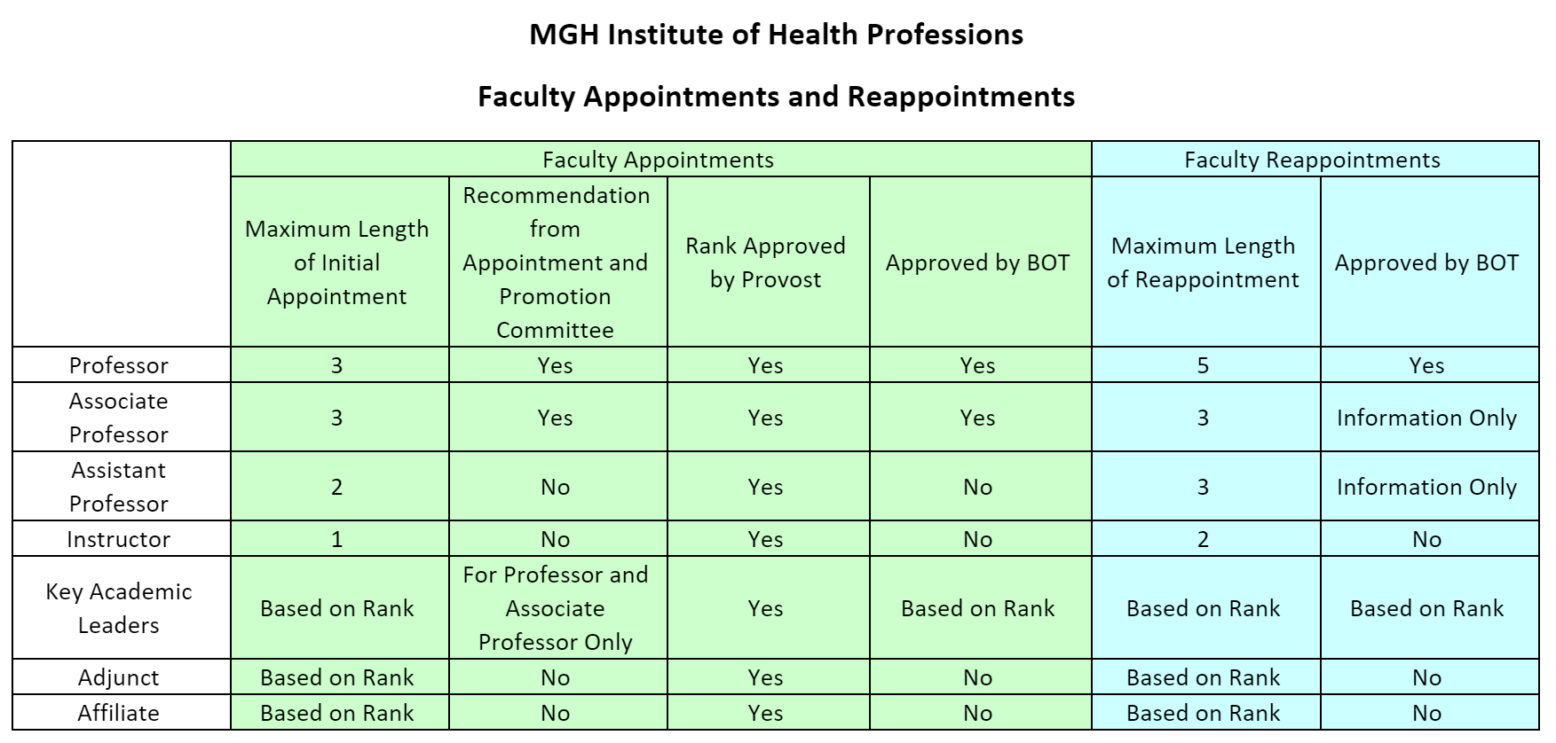 The term of appointment awarded a new faculty member typically ranges between one and three years. Faculty reappointments for full-time faculty are generally three years in length, with five-year appointments possible for faculty members employed for five or more years at the Institute and who hold academic rank of Associate Professor or higher. Faculty members hired on the basis of grant funding at all ranks may have shorter appointments if grant funding is not available for the typical appointment length. Department chairs and deans generally receive initial faculty appointments that are five years in length. Administrative appointments, e.g., department chair, dean, associate provost, provost, are granted on a year-to-year basis (or: are renewed annually, at the discretion of the Provost, subject to satisfactory performance and Institute need).