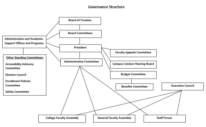 The campus governance structure allows for the inclusion and participation at various levels for all employees of the College. It is designed to provide a means for everyone to engage in some way in the conversations that define and develop our institution. Avenues for participation in decision-making include: communication and sharing information, consultation, voice, and vote. The governance structure is also designed to insure that decisions on important College matters are carefully considered, promptly made, and widely understood. It allows for participation by various campus groups—College Faculty, College Faculty Assembly, General Faculty, General Assembly, Staff Forum, students (represented by the Student Government Association), and administration. All of these groups function under the general supervision of the President as delegated by the Board of Trustees.